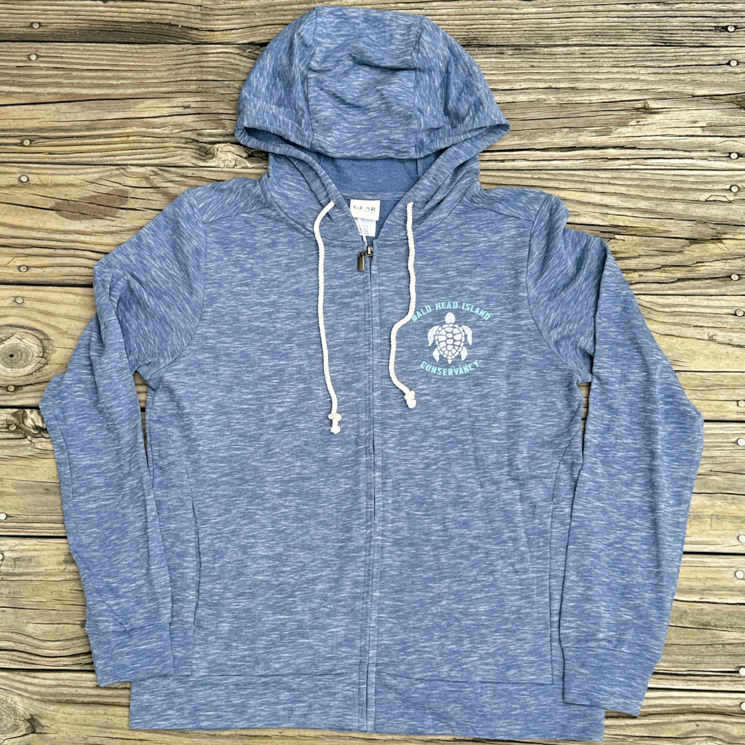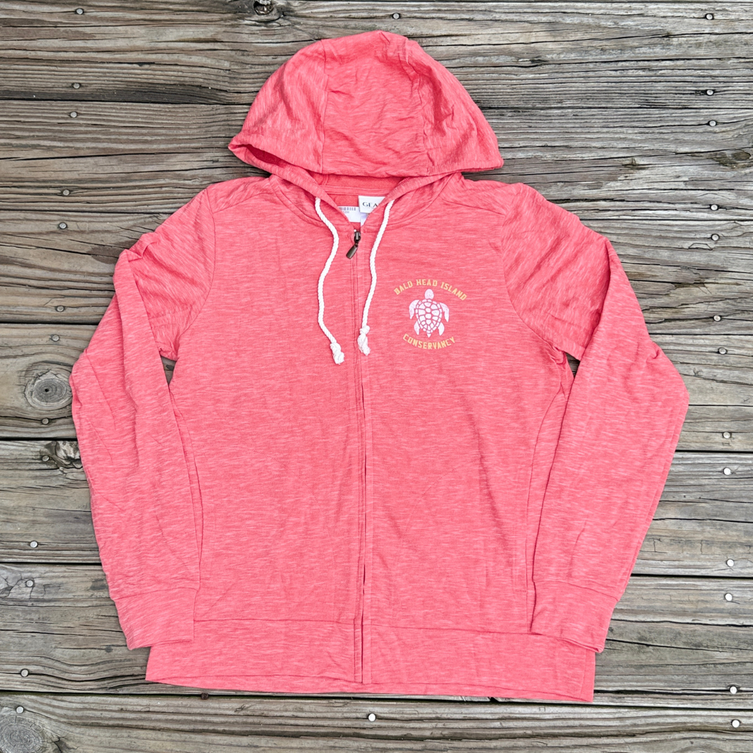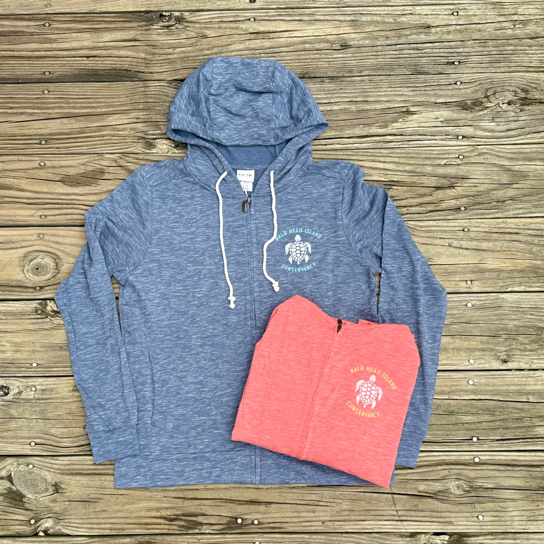 Regular price $54.98Layer up island-style with our Bald Head Island Conservancy Full Zip Long Sleeve T-Shirt. Lightweight and soft with a slim fit, this versatile long-sleeve hoodie is perfect for breezy beach walks, ferry rides, or cool summer nights. Featuring the Conservancy's signature sea turtle logo on the chest, it's a stylish way to show your support for the Conservancy. Available in two coastal-inspired colors: heathered blue and heathered coral.